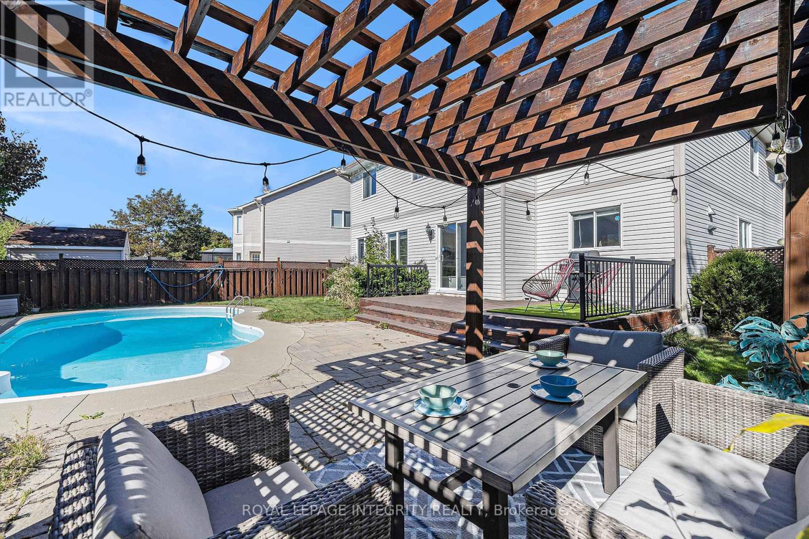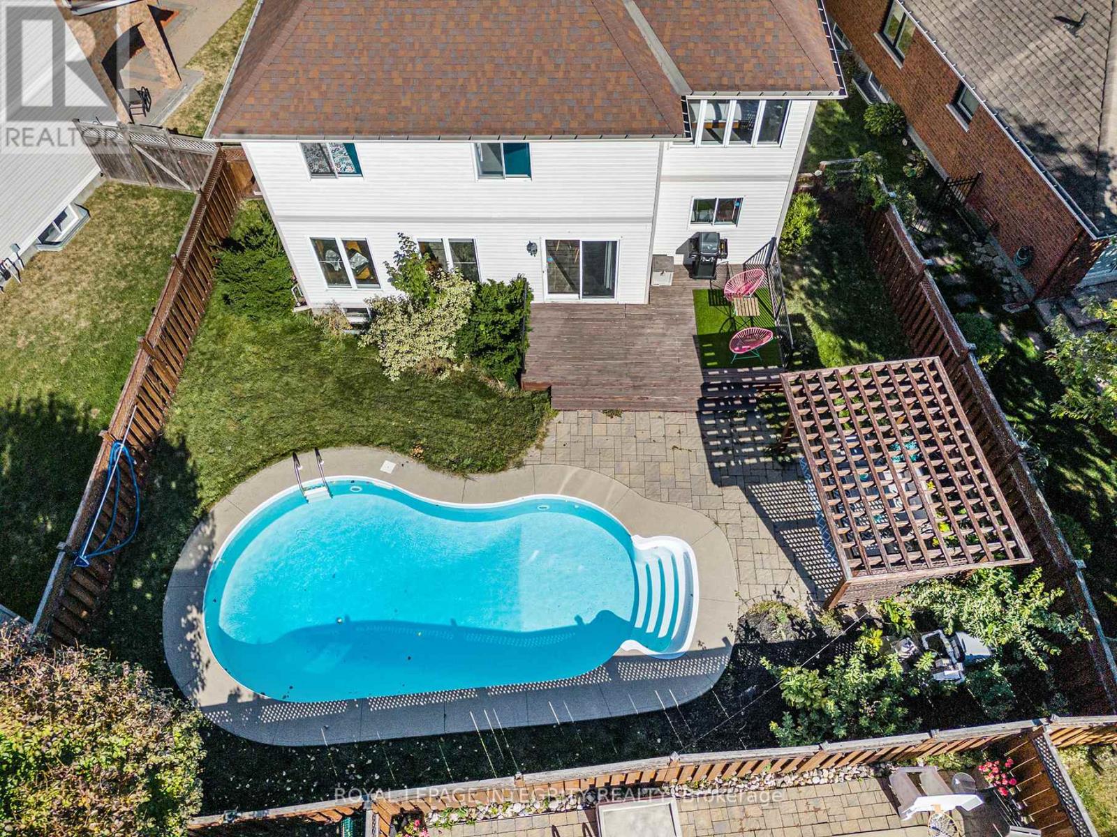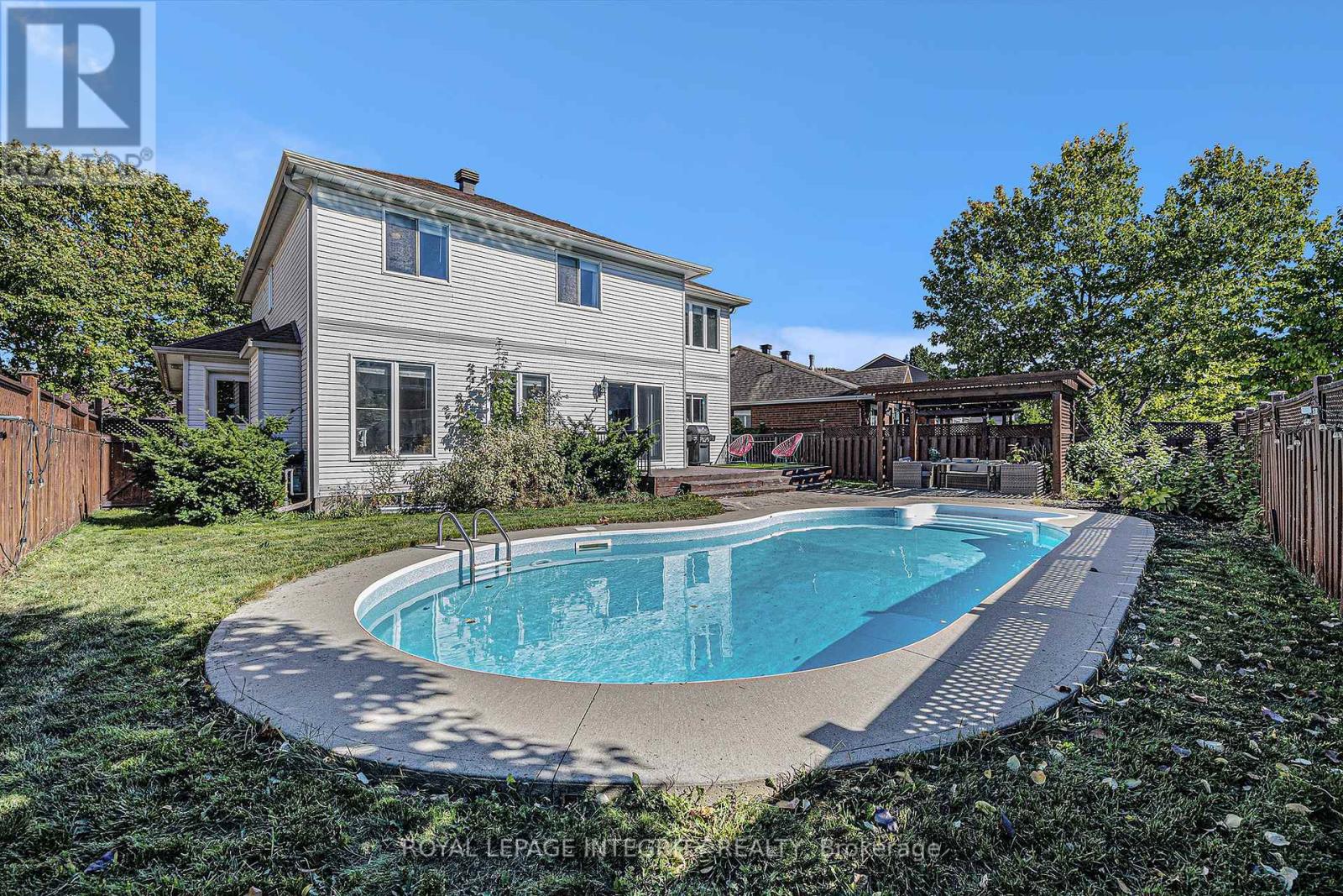 This exceptional 4-bedroom residence is tucked away on a quiet, family-friendly street. It offers the perfect blend of comfort, style, and functionality. This home is designed for both relaxed family living and effortless entertaining. Step into your own private backyard retreat, complete with a heated saltwater pool, a spacious deck for sunbathing or dining al fresco, a charming stone patio with a pergola, and a grassy area perfect for kids or pets to play. Inside, the bright and open layout is filled with natural light, featuring a combination of hardwood and vinyl flooring throughout. The soaring cathedral ceilings in the living room create an airy, inviting atmosphere, while the kitchen offers birch cabinetry, quartz countertops, a stainless steel apron-front sink, and a stylish backsplash. The kitchen seamlessly connects to the eat-in area and cozy family room, where a sunken layout and gas fireplace provide a warm welcoming space. A functional main-floor mudroom/laundry room with direct backyard access adds everyday convenience for active families. Upstairs, you'll find four spacious bedrooms, including a serene primary suite featuring an 4 piece ensuite with a soaker tub, your perfect end-of-day escape. Don't miss the opportunity to make it yours! (id:37351)