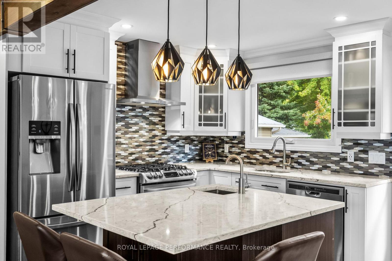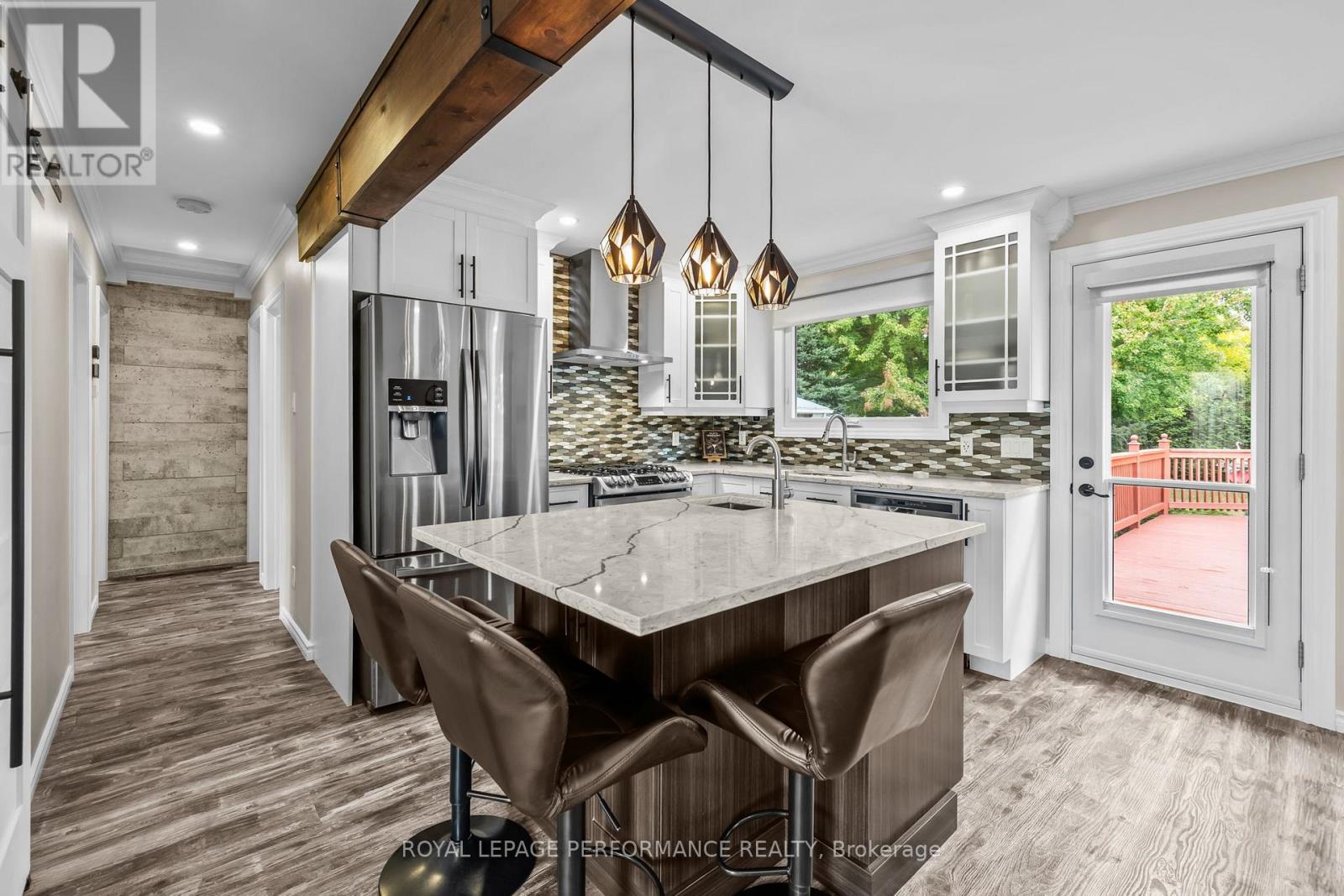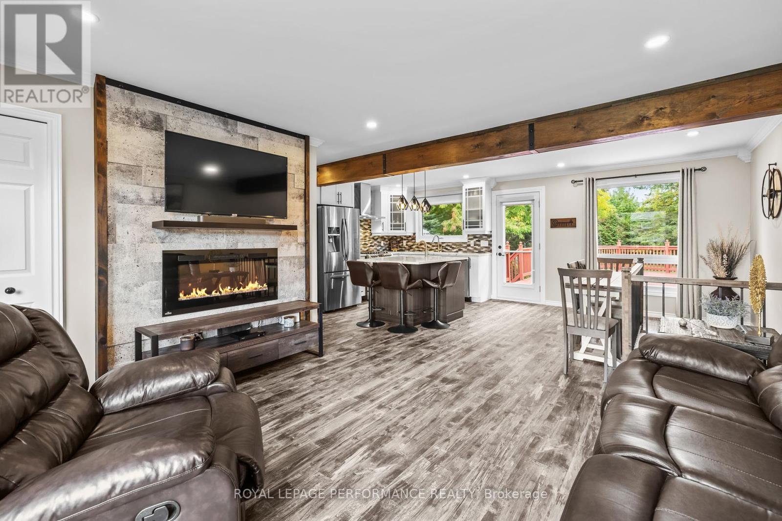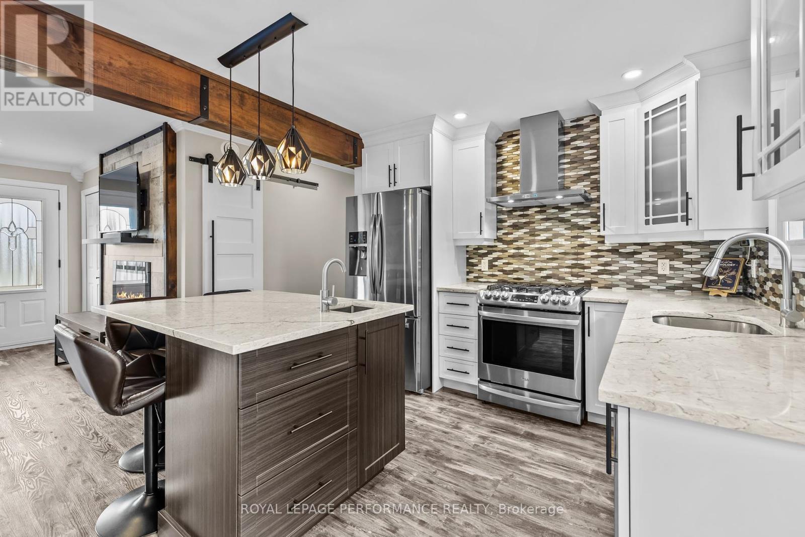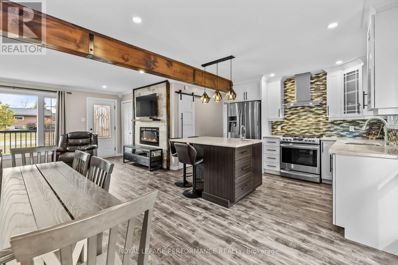 Welcome to 122 Maple Grove Street in the sought-after Forest Park community! Perfectly situated with easy access to Highway 417 and only 25 minutes from downtown Ottawa, this home is nestled on a quiet dead-end street and steps away from schools currently under expansion. Offering both convenience and privacy, step inside to a beautifully renovated home featuring an open-concept main floor with exposed beam, barn-door accents, and high end luxury vinyl flooring. The inviting living room with an electric fireplace flows seamlessly into the dining area and modern kitchen, complete with quartz countertops and direct access to a spacious (16' x 32') rear deck perfect for entertaining. Upstairs hosts three comfortable bedrooms and a full bath with granite countertops, while the fully finished basement extends your living space with an additional bedroom, a cozy family room with natural gas fireplace, a dry bar with granite countertops, built-in shelving, a second full bathroom with granite countertops, plus dedicated laundry, storage areas, & features a dri-core flooring system throughout. Car enthusiasts and hobbyists alike will love the insulated heated (natural gas) detached double garage (20' x 34') equipped with a metal roof, internet, heating, and water. Outside, the private backyard is a true retreat with mature trees, full fencing, an additional shed ('10x'14), and an impressive 100ft paved driveway + 72ft on the side of the garage leading to the shed. With modern renovations and smart functionality throughout, this home combines the best of private living with the convenience of municipal utilities. (id:37351)